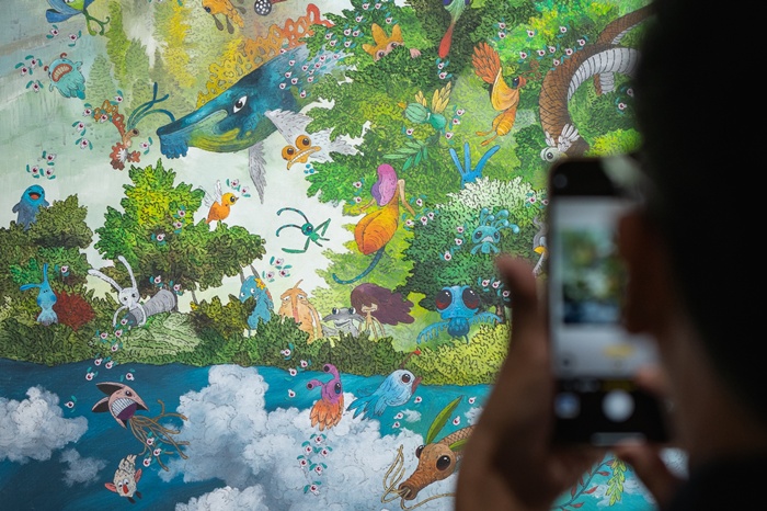 Lee Jaeyual – ผู้รังสรรค์งานที่ดูจากระยะไกลจะเหมือนจิตรกรรมเกาหลีแบบดั้งเดิม แต่เมื่อเข้าใกล้จะเห็นความทันสมัยอันโดดเด่น การผสมผสานสีอะคริลิกบนกระดาษสดใส เมฆและหมอกในพื้นหลังสร้างบรรยากาศลึกลับ ทำให้ผู้ชมรู้สึกเหมือนหลุดเข้าไปในอีกโลกหนึ่งที่เหนือจริง เทคนิค mixed media ผสานอิทธิพลตะวันออกและตะวันตกอย่างมีเอกลักษณ์ สวยงาม เงียบสงบ ชวนให้ครุ่นคิด แรงบันดาลใจมาจากความสัมพันธ์ระหว่างมนุษย์กับธรรมชาติ