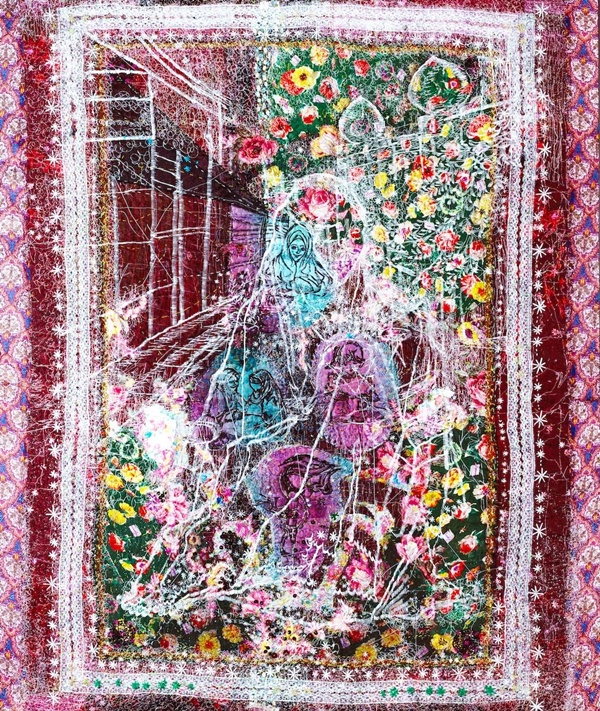 ดุอาอ์ (วิงวอนขอพร) โดยยามีล๊ะ หะยี ขนาด 180 x 150 ซม. เทคนิคเย็บปักถักร้อย ได้รับรางวัลชนะเลิศ การประกวดจิตรกรรมยูโอบี ประเทศไทย ครั้งที่ 16 ประจำปี 2568