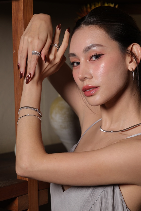 ปิดท้ายด้วยสาวสายแฟอย่าง ดาว-พิมพ์ทอง มาในแมกซี่เดรสยาว โทนเทาอ่อน เพิ่มลูกเล่นด้วยจิวเวลรี่ครบเซ็ต ไม่ว่าจะเป็น สร้อยคอ กำไล ต่างหู และแหวน สี White Gold จากคอลเลกชัน Masai ทำให้ลุคนี้มีมิติ และสะท้อนความงดงามเหนือกาลเวลาตามแบบฉบับของแบรนด์