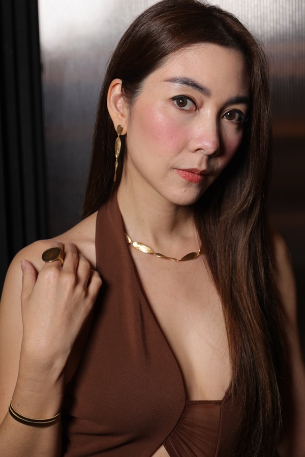 มิ้นท์-ภัทรศยา โฉบเฉี่ยวด้วยลุค เดรสยาวผ้าซาติน โดยไม่พลาดที่จะเลือก กำไล ต่างหู และแหวน สี Yellow Gold จากคอลเลกชัน Lunaria มาคอมพลีทลุคสุดปัง