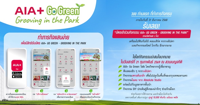 ทั้งนี้ เอไอเอ เตรียมจัดงาน AIA+ Go Green Festival – Grooving in the Park ในวันที่ 21 กุมภาพันธ์ 2569 ณ สวนเบญจกิติ ร่วมกับ กรุงเทพมหานคร และพันธมิตร อาทิ EEC, Layers of emotions, Aura, Absolute Boutique Fitness Studio, FORM Recovery, Yolo, McDonald’s, สมิติเวช และอื่น ๆ โดยในงานจะมีกิจกรรมมากมายที่จะมอบประสบการณ์ ความสนุกสนานควบคู่กับการเรียนรู้เรื่องความยั่งยืน ผ่านคอนเสิร์ตจากวงลิปตา กิจกรรมเวิร์กชอป การจัดการขยะ และการเดินทางที่ลดการปล่อยคาร์บอน ซึ่งนับเป็นงการผนวกความบันเทิงและสร้างการมีส่วนร่วมด้านสิ่งแวดล้อมเข้าด้วยกันอย่างลงตัว