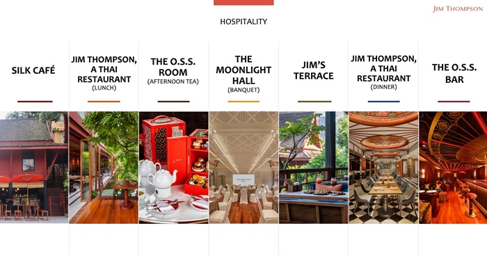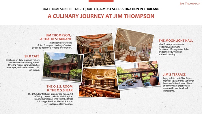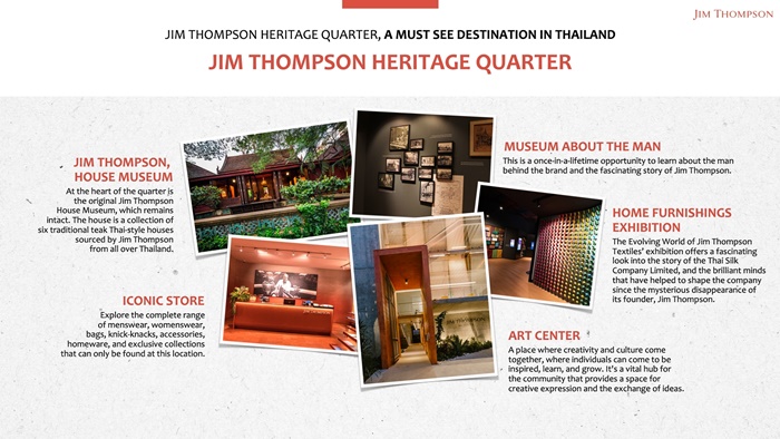 Jim Thompson Heritage Quarter โฉมใหม่เป็นที่สุดแห่งแลนด์มาร์กทางวัฒนธรรมและการท่องเที่ยว โดดเด่นด้วยบรรยากาศที่เงียบสงบและร่มรื่นดั่งโอเอซิสใจกลางกรุงเทพฯ โดยไลฟ์สไตล์เดสติเนชันแห่งนี้ ประกอบไปด้วยที่เที่ยวและร้านอาหารมากมายพร้อมตอบสนองทุกความต้องการ ได้แก่ ‘พิพิธภัณฑ์บ้านจิม ทอมป์สัน’ บ้านเรือนไทยทรงคุณค่าที่โด่งดังไปทั่วโลก นิทรรศการ ‘Museum About the Man’ บอกเล่าเรื่องราวชีวิตอันน่าทึ่งของจิม ทอมป์สัน นิทรรศการ The Evolving World of Jim Thompson Textiles สำรวจการเดินทางของผืนผ้าและความเป็นมาของลวดลายผ้าอันเป็นเอกลักษณ์ The Iconic Store สโตร์ที่นำเสนอผลิตภัณฑ์หลากหลายจากแบรนด์ พร้อมโซนอาหารและเครื่องดื่มใหม่ล่าสุดในดีไซน์สุดไอคอนิก ทั้ง ‘ร้านอาหารไทย จิม ทอมป์สัน’ ‘The O.S.S. Bar’ บาร์สุดฮิป ‘The O.S.S. Room’ ห้องชายามบ่าย‘Jim’s Terrace’ คาเฟ่สไตล์ไทย-ทาปาสริมระเบียงวิวบ้านไทยแสนงดงาม Silk Café คาเฟ่สวยในบรรยากาศร่มรื่น รวมถึง Moonlight Hall ห้องจัดอีเวนต์อเนกประสงค์ที่ตกแต่งอย่างงดงาม โดยสถานที่ทั้งหมดนี้ยังอยู่ใกล้กับ ‘Jim Thompson Art Center’ พื้นที่แห่งความคิดสร้างสรรค์เพื่อคนรักศิลปะ