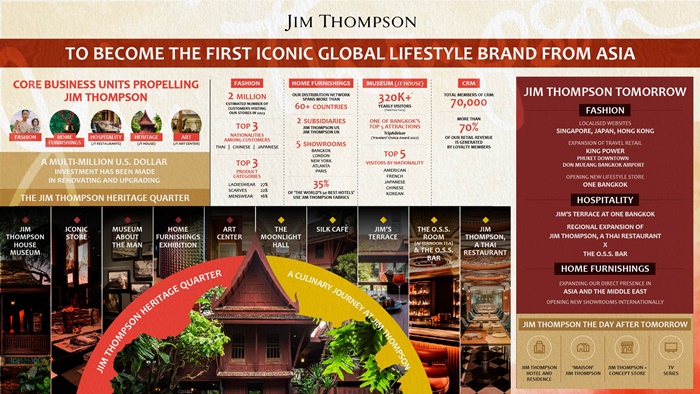 การเปิด Jim Thompson Thompson Heritage Quarter เต็มรูปแบบนับเป็นก้าวสำคัญของแบรนด์ในการตอกย้ำภาพลักษณ์แบรนด์ไอคอนิกไลฟ์สไตล์ระดับโลกจากเอเชีย สอดรับกับวิสัยทัศน์ ‘Beyond Silk’ หรือการมอบผลิตภัณฑ์และบริการที่ก้าวไกลไปกว่าการเป็นแบรนด์ผ้าไหมไทย ไม่ว่าจะเป็นธุรกิจแฟชั่น ธุรกิจสินค้าผ้าตกแต่งบ้าน ตลอดจนธุรกิจบริการและร้านอาหาร ซึ่งทั้งหมดนับเป็นการสานต่อวิสัยทัศน์อันกว้างไกลของผู้ก่อตั้งแบรนด์อย่าง เจมส์ แฮร์ริสัน วิลสัน ทอมป์สัน สถาปนิกจากนิวยอร์กที่เคยเป็นทหารประจำสำนักงานด้านยุทธศาสตร์ (Office of Strategic Services — OSS หรือ CIA ในปัจจุบัน) ผู้หลงใหลศิลปะและผลักดันอุตสาหกรรมผ้าไหมไทยให้ก้าวไกลในเวทีระดับสากล จนได้รับการยกย่องให้เป็น ‘ราชาไหมไทย’