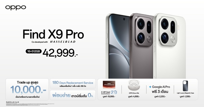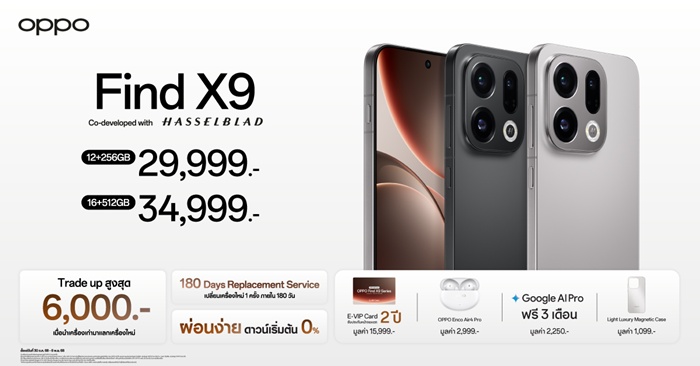เป็นเจ้าของ OPPO Find X9 Series ได้แล้ววันนี้ โดย OPPO Find X9 Pro มาพร้อมความจุ 16+512GB ใน 2 สี ได้แก่ สีขาว Silk White และสีเทา Titanium Charcoal ในราคา 42,999 บาท ส่วน OPPO Find X9 มีให้เลือกสองรุ่นความจุ 12+256GB และ 16+512GB พร้อมมีให้เลือก 2 สี ได้แก่ สีเทา Titanium Grey และสีดำ Space Black ราคาเริ่มต้นที่ 29,999 บาท เปิดจำหน่ายพร้อมกันทั่วประเทศ ณ OPPO Brand Shop ทุกสาขาและตัวแทนจำหน่ายทั่วประเทศ พร้อมโปรโมชั่นสุดพิเศษช่วงเปิดตัว