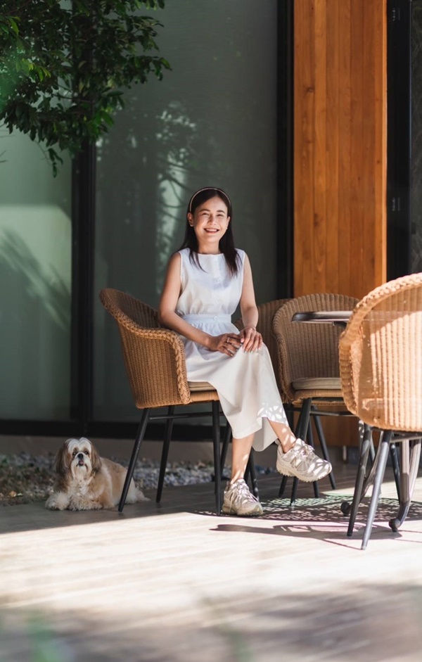 …เรียกว่าตอนนี้เจี๊ยบเองก็จะใช้ชีวิตอยู่ที่กาญจน์เป็นหลักค่ะ นอกจากจะมีต้องไปมีทติ้งกับลูกค้า ก็จะมีเข้าไปกรุงเทพฯ บ้าง ส่วนถ้ามีคุยงานปกติก็จะคุยผ่าน Zoom และ Tools ต่างๆ บางครั้งนั่งประชุมอยู่ในสวน แฮปปี้มาก ได้สูดอากาศบริสุทธิ์ ไม่ค่อยเครียด ความสงบทำให้คิดงานออก รู้สึกผ่อนคลาย ได้เห็นสีเขียวๆ ของต้นไม้ใบหญ้า เล่นกับโมจิ (น้องหมาที่น่ารัก) มีความสุขมากที่สุดเลยค่ะ