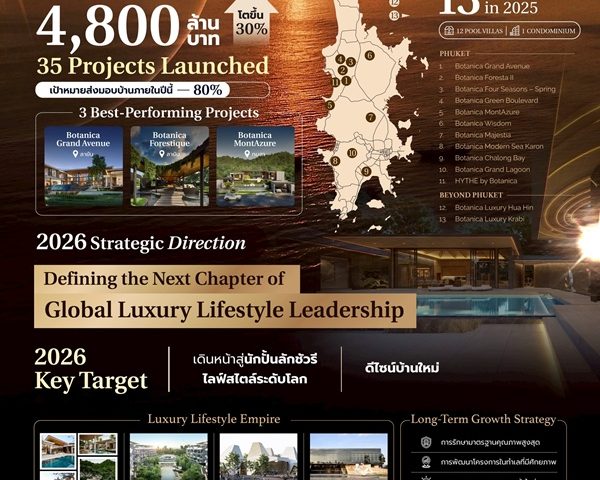 โบทานิก้า ลักซูรี่ วิลล่า (Botanica Luxury Villas) ผู้นำด้านการพัฒนาอสังหาริมทรัพย์ระดับลักชัวรีในเกาะภูเก็ตและหัวเมืองสำคัญด้วยประสบการณ์และความเชี่ยวชาญยาวนานกว่า 20 ปี เผยปิดท้ายปี 2568 อย่างสวยงามด้วยยอดขายทะลุ 4,800 ล้านบาท เติบโต 30% เทียบกับปีก่อนหน้า สวนกระแสตลาดอสังหาริมทรัพย์ที่ชะลอตัวในภาพรวม โดยความสำเร็จมาจากการเปิดตัว 13 โครงการใหม่ครอบคลุมทั้งพูลวิลล่าหรูและคอนโดมิเนียมหรูในปี 2568 ตอกย้ำความเป็นเจ้าตลาดเซกเมนต์ลักชัวรีที่ครองใจนักลงทุนและกลุ่มผู้มีความมั่งคั่งสูง ทั้งไทยและต่างชาติอย่างต่อเนื่อง โดยในปี 2569 บริษัทเตรียมส่งมอบวิลล่าให้ลูกค้ามากถึง 80% พร้อมประกาศแผนเดินหน้าเต็มสูบ ลุยขยายธุรกิจครบวงจรสู่คอนโดมิเนียม รีเทล และไลฟ์สไตล์แลนด์มาร์ก พร้อมผลักดันโครงการในหัวเมืองอื่นๆ อย่างเข้มแข็ง เดินหน้าสู่บทบาทนักปั้นอาณาจักรลักชัวรีไลฟ์สไตล์ระดับโลก ร่วมขับเคลื่อนให้ไทยเป็นเดสติเนชันเพื่อการอยู่อาศัยชั้นนำของโลก