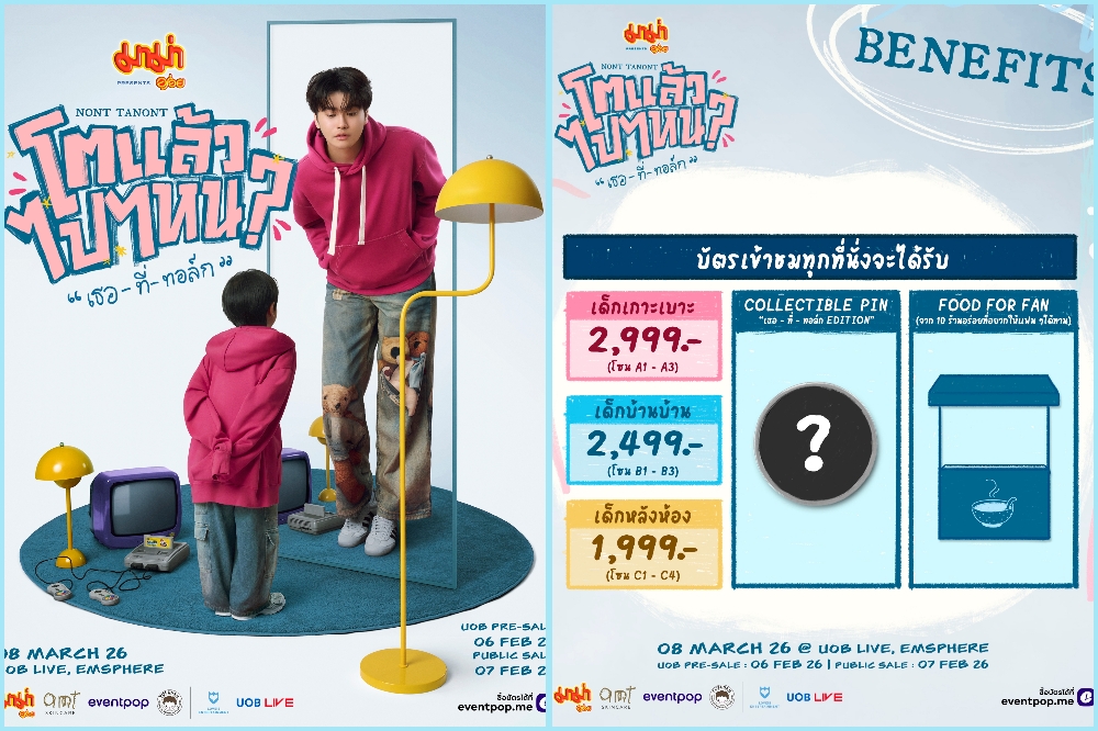 มาร่วมหาคำตอบกับ ‘นนท์ ธนนท์’ และฉลองวันเกิดครบรอบวัย 30 ปีนี้ ด้วยกันที่ งาน “มาม่า Presents NONT TANONT โตแล้วไปไหน? “เธอ-ที่-ทอล์ก” จัดแสดงในวันเสาร์ที่ 8 มีนาคม 2569 ที่ UOB LIVE, EMSPHERE บัตรราคา 2,999 / 2,499 / 1,999 บาท สามารถจับจองที่นั่งได้ ในวันที่ 6 กุมภาพันธ์ 2026 รอบ UOB Pre-Sale และรอบบุคคลทั่วไป ในวันที่ 7 กุมภาพันธ์ 2026 ผ่านทาง Eventpop หรือ https://www.eventpop.me