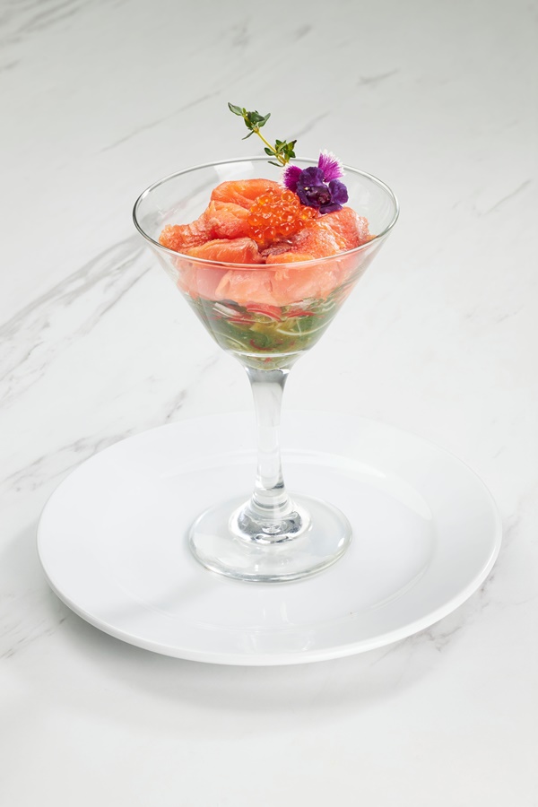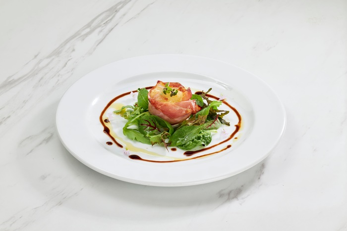 สำหรับคอร์ส “New Year Celebration Set” เริ่มต้นความพิเศษด้วยเมนูเรียกน้ำย่อย Roasted Fig with Parma Ham and Brie Cheese ลูกฟิกย่างรสหวานอมเปรี้ยว เข้ากันกับพาร์มาแฮมรสเค็มมัน และชีสบรีได้เป็นอย่างดี ต่อด้วยเมนู Spicy Smoked Salmon แซลมอนสดชิ้นพอดีคำ คลุกเคล้าน้ำยำรสจัดจ้านกลมกล่อม