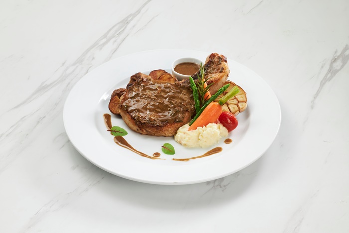 หรือจะเลือกรับเป็น Garlic Rosemary with Balsamic Pork Chop & Greens พอร์คชอปชิ้นโตที่ย่างจนได้ความสุกตามชอบ ทานคู่แคร์รอตและมันฝรั่งบด ที่ช่วยเสริมรสสัมผัสได้อย่างมีมิติ