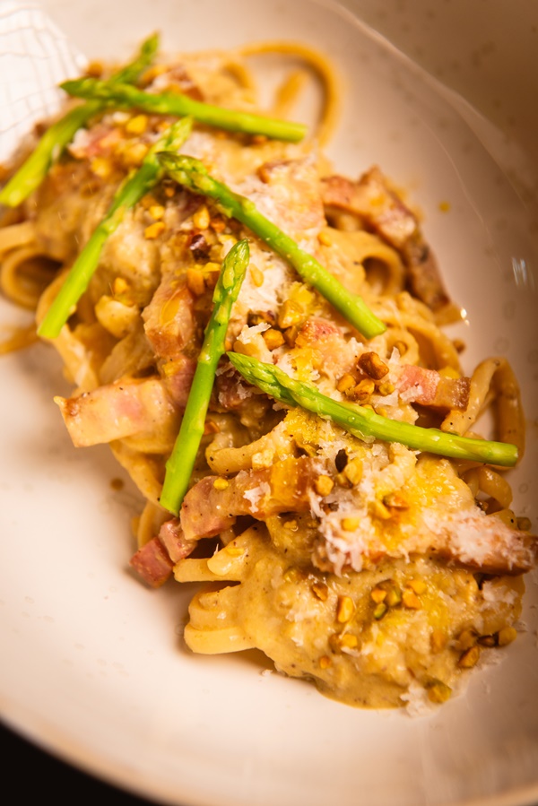 “Pistachio Carbonara” คาร์โบนาร่าพิสตาชิโอ คลุกเคล้าด้วยเนื้อหมูสามชั้นหมักเกลือแพนเชตต้า ท็อปด้วยหน่อไม้ฝรั่ง