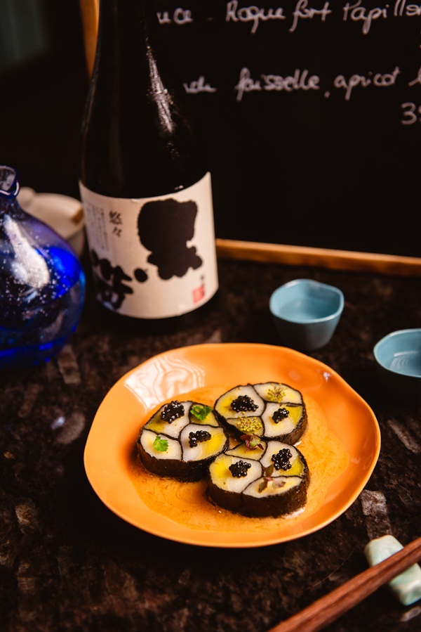“Leeks Miso” สาหร่ายโนริ ท็อปด้วยไข่ปลาคาเวียร์ ราดด้วยซุปมิโซะผสมต้นกะเทียม
