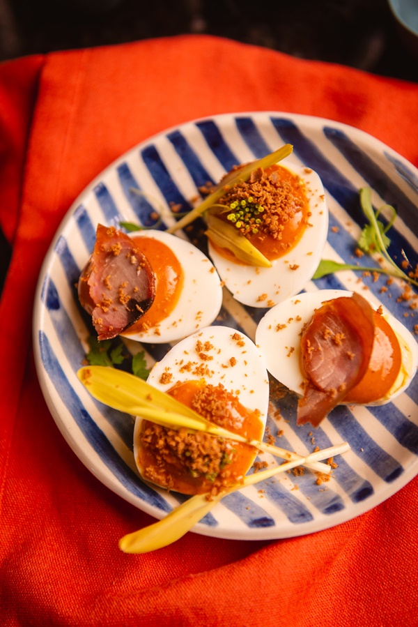 “Free Range Eggs Mimosa” ไข่ไก่ฟรีเรนจ์มิโมซ่า ราดด้วยมายองเนสกิมจิ ปิดท้ายด้วยปลาเค็มโบนิโตะบอตตาร์กา