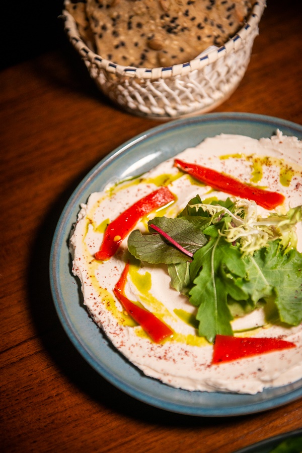 “Cashew Nuts Hummus” เม็ดมะม่วงหิมพานต์ที่ผสมผสานกับเครื่องเทศ ท็อปด้วยใบมิซูนะ และเฮเซลนัท