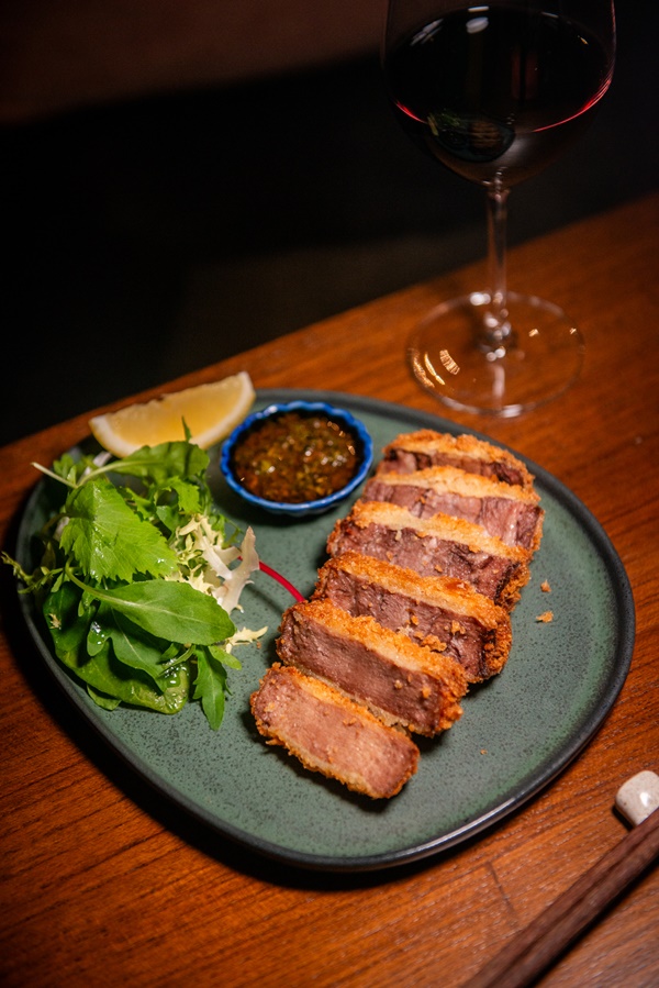 “Beef Tongue Milanaise” ลิ้นวัวมิลานีส เคล้าด้วยซอสเชอร์มูล่า ผสมมะนาว พร้อมเครื่องเคียงอย่างผักสด