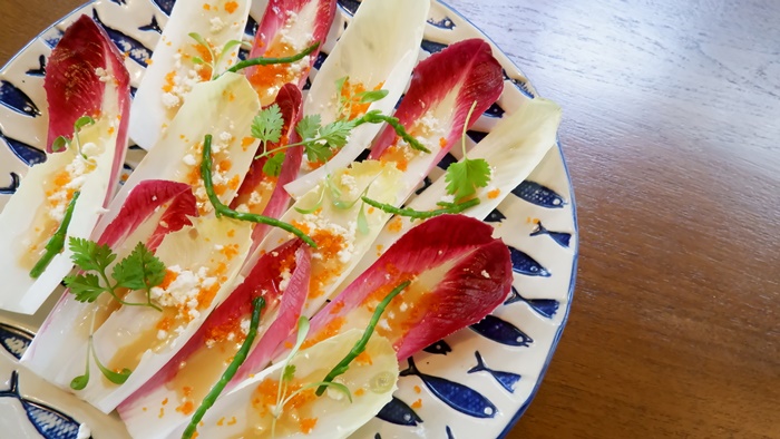 “Endive Feta Shizo” สลัดผักเอ็นไดฟ์ ราดด้วยน้ำสลัด XO จากชิชิลี โรยด้วยไข่กุ้ง และเฟต้าชีส ดีต่อสุขภาพ