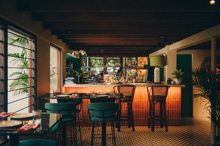 บริเวณที่นั่งภายในร้านเป็นสไตล์คอมนูนอล (Communal Style) เพื่อสร้างบรรยากาศความเป็นกันเองเหมือนมาสังสรรค์บ้านเพื่อนร่วมกัน พื้นที่ตรงกลางแบ่งโซนด้วยพาติชั่น แต่ยังสามารถเชื่อมโยงถึงกันได้ โซนที่นั่งริมผนังสามารถมองเห็นวิวสวนรอบบ้านผ่านกระจกใส ถัดลงไปอีกสเต็ปท์เป็นเคาน์เตอร์บาร์ มุมนี้มีความเป็นส่วนตัวมาก และโซนเอ้าท์ดอร์ในสวนที่สามารถจัดเลี้ยงสังสรรค์ได้ บรรยากาศเข้ากับชื่อร้าน “SABABA” ที่มาจากภาษาฮีบรู แปลว่า “สบายสบาย”