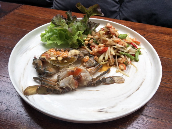 เมนูต่อไป คือ ส้มตำปูดองเทพรส ปูไข่ดองจากสมุทรสาครสดๆ เป็นๆ นำมาทำความสะอาดด้วยโซดาแล้วนำมาดองกับสูตรน้ำปลาดีแล้วหลังจากนั้นนำไปแช่ในช่องแช่แข็งทันทีก่อนนำมาเสิร์ฟความอร่อยกับน้ำจิ้มซีฟู้ดแบบแซ่บๆ