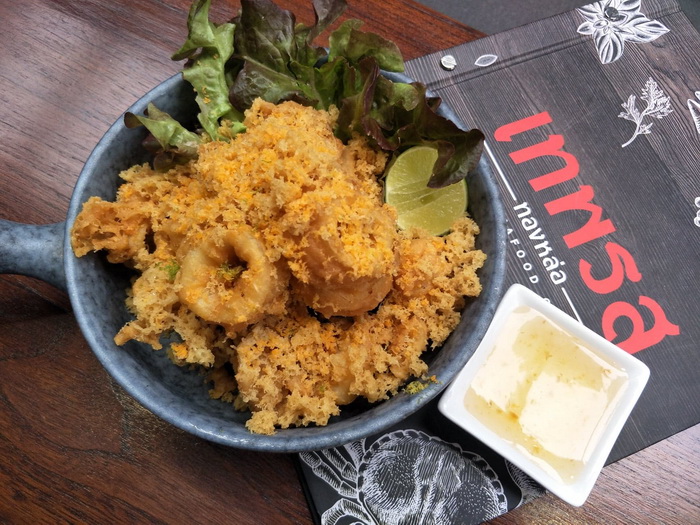 หมึกกรอบไข่เค็ม จากผลตอบรับของกุ้งกรอบไข่เค็ม ที่เป็นอาหารขายดี ก็ต่อยอดมาเป็นปลาหมึกกรอบไข่เค็ม คือ การนำแป้งผสมกับไข่แดงเค็ม นำปลาหมึกสดมาชุบแป้งที่ผสมกับไข่เค็ม แล้วนำไปทอดกรอบ จากนั้นนำมาพักทิ้งไว้ให้สะเด็ดน้ำมัน แล้วนำมาจัดจาน จากนั้นขูดไข่แดงเค็ม โรยบนปลาหมึกกรอบไข่เค็ม แล้วขูดผิวมะนาวโรยบนปลาหมึกกรอบไข่เค็ม จากนั้นก็นำไปเสิร์ฟได้เลย