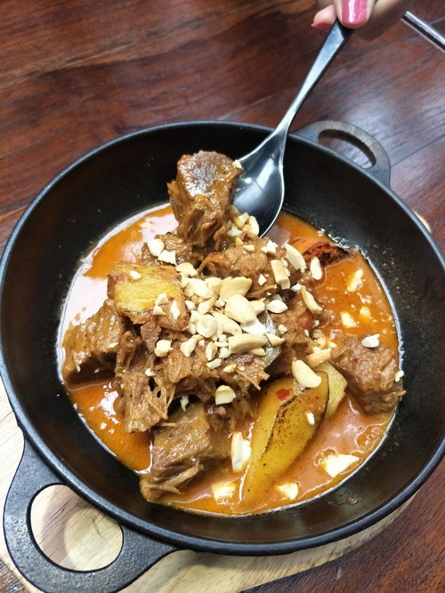 มัสมั่นเนื้อน่องลาย มัสมั่นแกงแก้วตาหอมยี่หร่ารสร้อนแรง เป็นเมนูที่ติดอันดับความอร่อย ที่ใครมาแล้วต้องสั่ง เพราะเลือกน่องมาตุ๋นเคี่ยวจนนุ่มเสร็จแล้ว เติมกะทิให้นำเข้ากับเนื้อใส่เครื่องแกง แล้วเคี่ยวไปเรื่อยๆจนเข้าเนื้อ จากนั้นตักใส่กระทะร้อนพร้อมเสิร์ฟ