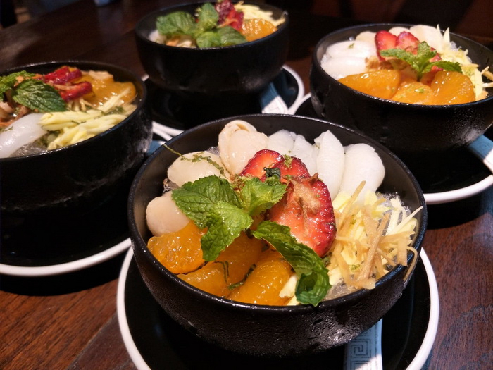 อิ่มหนำกับเมนูอาหารคาวแล้ว มาถึงเมนูของหวานสุดเด็ดที่ทางร้านเทพรสภูมิใจนำเสนอเป็นอย่างยิ่ง นั่นคือ “ส้มฉุน” เป็นของว่างโบราณ คล้ายๆ ลอยแก้ว เย็นชื่นฉ่ำ ด้วยรสเปรี้ยวหวานของส้มซ่า สตรอเบอร์รี่ ลิ้นจี่ ลูกตาล ขิง ผิวมะนาวขูดฝอย และหอมเจียว ให้รสชาติกลมกล่อม แสนอร่อย จนต้องร้องพระเจ้า! !!! กันเลยทีเดียว
