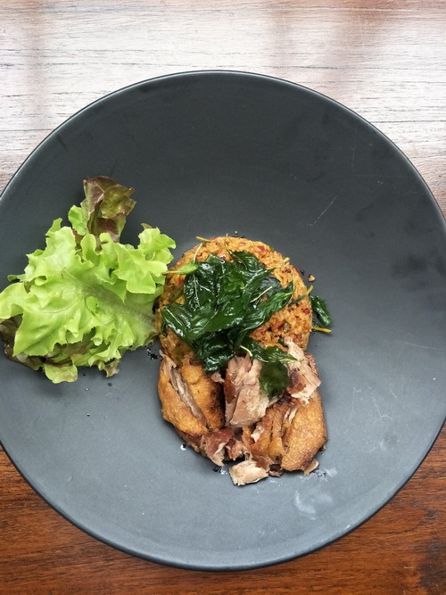 ข้าวกะเพราคั่วเป็ดกรอบ เป็นอาหารจานเดียวที่ใครๆ บอกว่าหอมกลิ่นคั่วกะเพรา นำเป็ดทอดกรอบมาคั่วกับกะเพราและพริกสับให้หอมแล้วนำข้าวมาคลุก จากนั้นตกแต่งจานพร้อมเสิร์ฟ