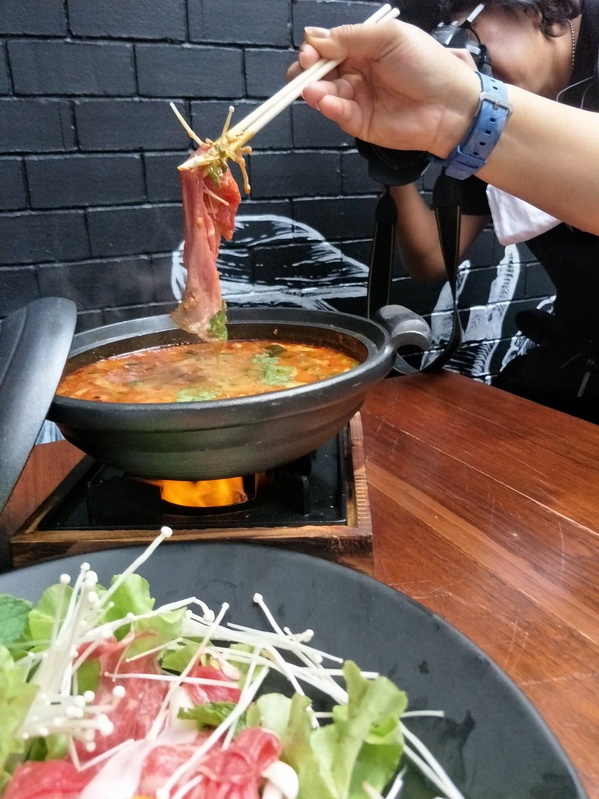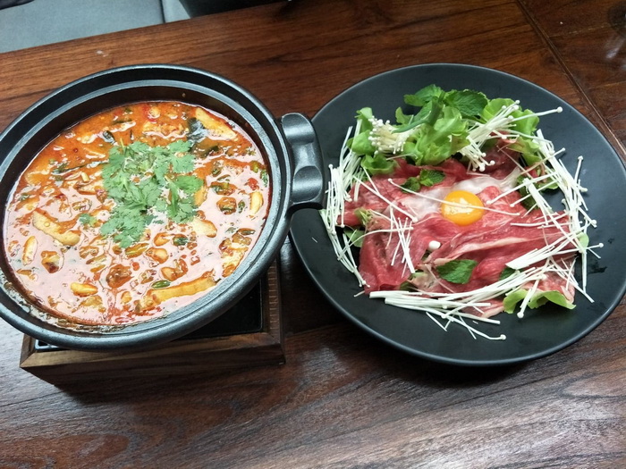 อีกเมนูแนะนำคือ ต้มยำเนื้อวากิวน้ำข้นคลั่ก ต้มยำสมุนไพร ข่า ตะไคร้ พริกขี้หนู จากนั้นเตรียมน้ำต้มยำใส่ไข่แดง 1ฟอง และใส่นมข้นจืด แล้วนำมาใส่มันกุ้งข้นๆ เพื่อให้เห็นถึงความข้นของน้ำต้มยำ เสิร์ฟกับวากิวที่สไลด์บางเพื่อให้เห็นลายของเนื้อวากิว เคล็ดลับการกินให้แซ่บที่สุดคือ เมื่อน้ำต้ำยำเดือดแล้ว ใช้ตะเกียบคีบวากิวที่สไลด์บางเฉียบ จุ่มลงไป หายใจเข้าครั้ง แล้วยกเข้าปากเลย จะได้ทั้งความหวานมันของน้ำต้มยำและเนื้อนุ่มละลายในปาก
