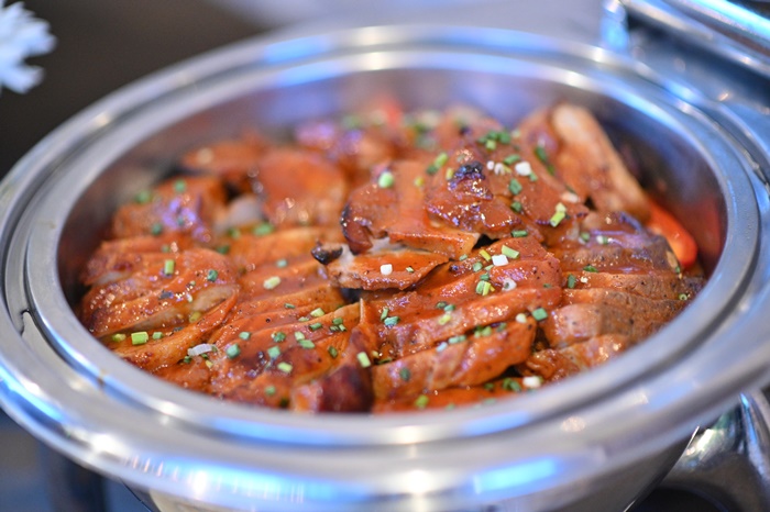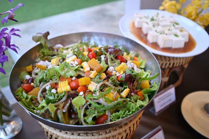 อาหารค่ำวันนี้จัดเต็มมาก มีมุมอาหารสุขภาพ สลัดเต้าหู้ขาวแบบญี่ปุ่น สลัดธัญพืช ทาร์ตผลไม้ ผลไม้สด และขนมหวาน ส่วนเมนูหลัก อาทิ ข้าวผัดสไตล์ฝรั่งเศส สปาเกตตี้ผัดพริกกระเทียมเบคอน ผักโขมอบชีส ไก่ย่างซอสเสาวรส สันคอหมูอบซอสบาร์บีคิว ฯลฯ