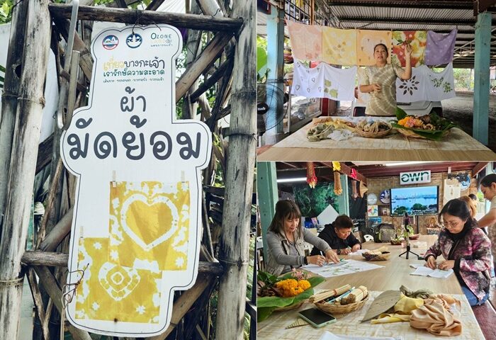 วันนี้เราเลือกทำกิจกรรมผ้ามัดย้อมจากสีธรรมชาติ โดยวัตถุดิบที่หาได้ในชุมชนบางกอบัว อาทิ ลูกจาก ใบหูกวาง แก่นฝาง ขมิ้น ดาวเรือง และใบพิลังกาสา ขั้นตอนการทำก็ไม่ยากเลยค่ะ เลือกผืนผ้าและลวดลายที่ต้องการ เช่น ลายดอกไม้ มะลิ กุหลาบ ลายหัวใจ ลาย “กระเพาะหมู” ที่เป็นสัญลักษณ์ของ “บางกะเจ้า” แล้วทำการมัดลายด้วยอุปกรณ์ เช่น หนังยาง ไม้ไอติม ลูกแก้ว ก้อนหิน ฯลฯ