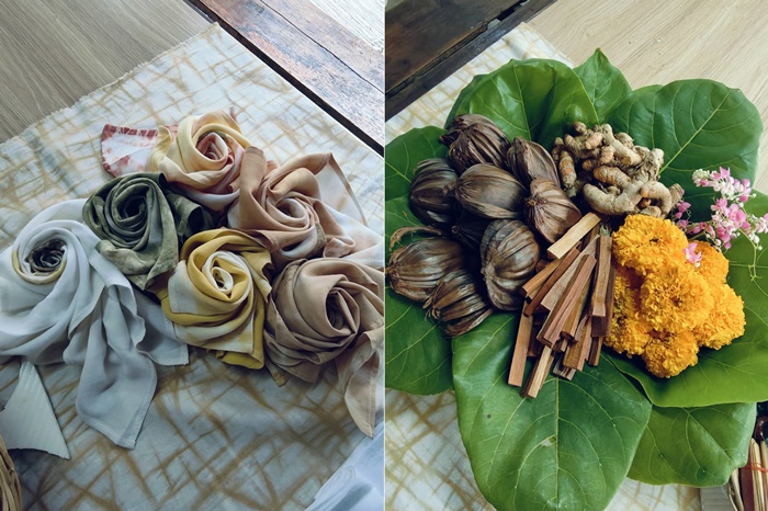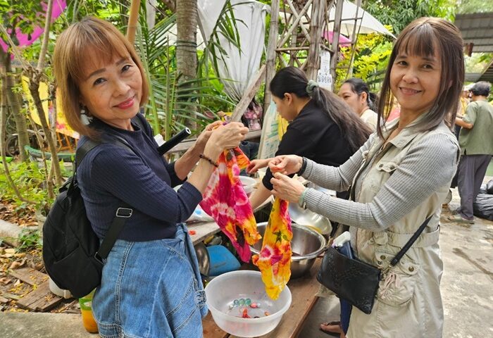 จากนั้นนำไปย้อมในสีที่ได้จากวัตถุดิบธรรมชาติ วันนี้มีให้เลือก 2 สี คือ สีแดงจากแก่นฝาง และสีเหลืองจากขมิ้นผสมดาวเรือง เมื่อนำผ้าที่มัดลายแล้วลงไปจุ่มลงในน้ำแล้ว ขยำให้น้ำซึมเข้าไปในผ้าให้ทั่วถึง ทิ้งไว้ประมาณหนึ่งชั่วโมง เมื่อแกะหนังยางที่มัดลายออก จะได้ผ้ามัดย้อมลายสวยฝีมือตัวเอง กิจกรรมนี้สนุกตรงที่ได้ลุ้นว่าลวดลายที่ตัวองทำจะออกมายังไง นอกจากจะได้เรียนรู้การย้อมผ้าด้วยสีธรรมชาติ ด้วยวิธีย้อมเย็น (ไม่ใช้ความร้อน) ยังได้ผ้ามัดย้อมลวดลายและสีสันเป็นของตัวเอง ไม่ซ้ำใคร กลับบ้านไปเป็นของฝากอีกด้วย เป็นกิจกรรมที่ทั้งภูมิใจและอิ่มใจสุดๆ