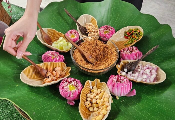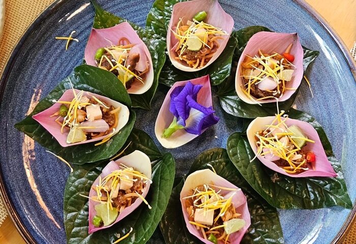 เริ่มต้นด้วยเมนูเรียกน้ำย่อย การะเกดสำรับต้น ประกอบด้วย เมี่ยงคำกลีบบัวหลวง ที่จัดวางมาอย่างสวยงามน่ากิน ขนาดพอดีคำ จัดมาให้ทั้งแบบกลีบบัวหลวงและใบชะพลู ใครได้ลองชิมแล้วรับรองหยุดไม่ได้