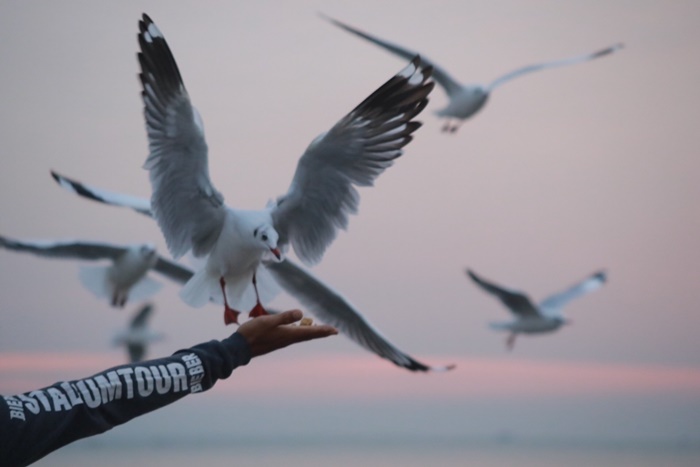 ในช่วงเดือน พย. – เมย. จะมีนกนางนวลนับหมื่นตัวหลายสายพันธุ์ อพยพหนีหนาวมาที่ชายทะเลบางปู อาทิ นกนางนวลหางดำ นกนางนวลหลังดำพันธุ์รัสเซีย นกนางนวลพันธุ์มองโกเลีย นกนางนวลขอบปีกขาว นกนางนวลปากเรียว ในช่วงนี้จะเนืองแน่นด้วยนักท่องเที่ยว ที่มาให้อาหารนกนางนวล และถ่ายรูปนกนางนวล และชมพระอาทิตย์ตกที่สะพานสุขตา