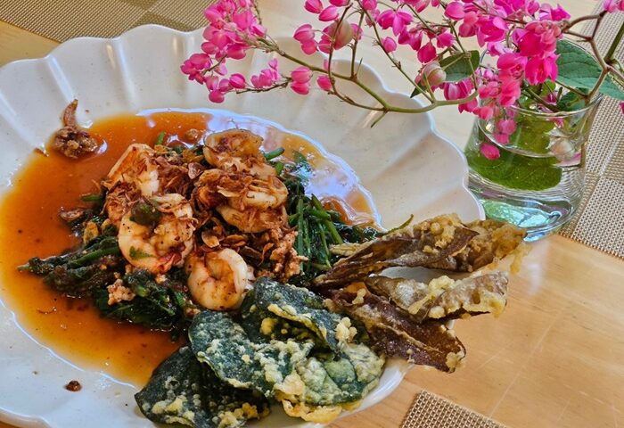 ยำผักกูดกุ้งสดแนมใบพิลังกาสา (ผักสามน้ำคุ้งบางกะเจ้า) เมนูสำหรับคนรักสุขภาพ ยำผักกูดจานนี้น้ำยำเปรี้ยวหวานจัดจ้าน กุ้งสดเนื้อเด้ง โรยด้วยหอมเจียว ทานคู่กับผักพื้นถิ่นทอดกรอบ คือ “พิลังกาสา” เป็นพืชน้ำในคุ้งบางกะเจ้า มีสรรพคุณต้านมะเร็งตับ เมื่อนำมาชุบแป้งทอดกรอบ ทานแล้วไม่รู้เลยว่าเป็นผัก เด็กๆ ทานได้ แถมชอบด้วย