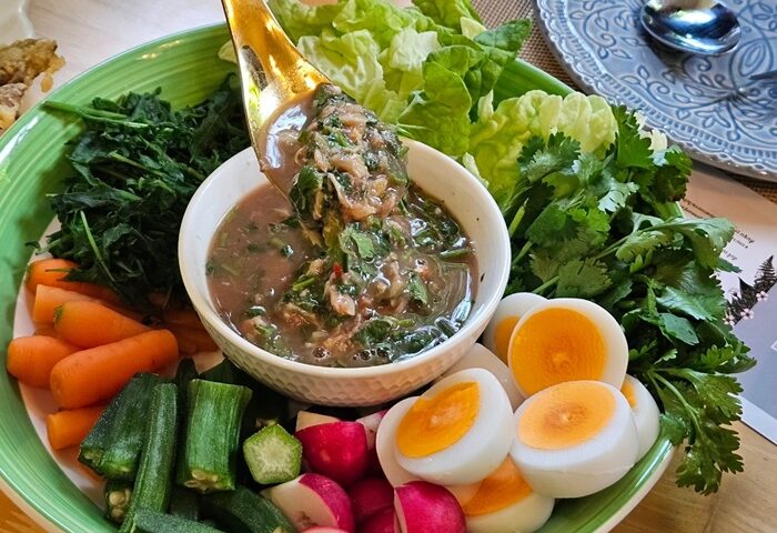 อีกหนึ่งเมนูที่เหมือนเป็นอาหารพื้นบ้านทั่วไป แต่รสชาติไม่ธรรมดา คือ น้ำพริกผักชีกุ้งสับ แนมด้วยผักสดอินทรีย์ และไข่เป็ดไล่ทุ่งต้มแบบยางมะตูม น้ำพริกผักชีเป็นเมนูที่หาทานยาก ผักชีมีสรรพคุณช่วยบำรุงไต บำรุงสมอง ส่วนไข่เป็ดไล่ทุ่งมีฤทธิ์เย็น ช่วยปรับสมดุลในร่างกาย รสชาติน้ำพริกกลมกล่อมกำลังดี ไม่เผ็ดมาก หอมกลิ่นผักชีอวลในปาก เพิ่งเคยทานครั้งแรก แต่ติดใจจนอยากกลับมาทานอีก