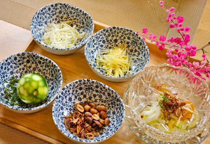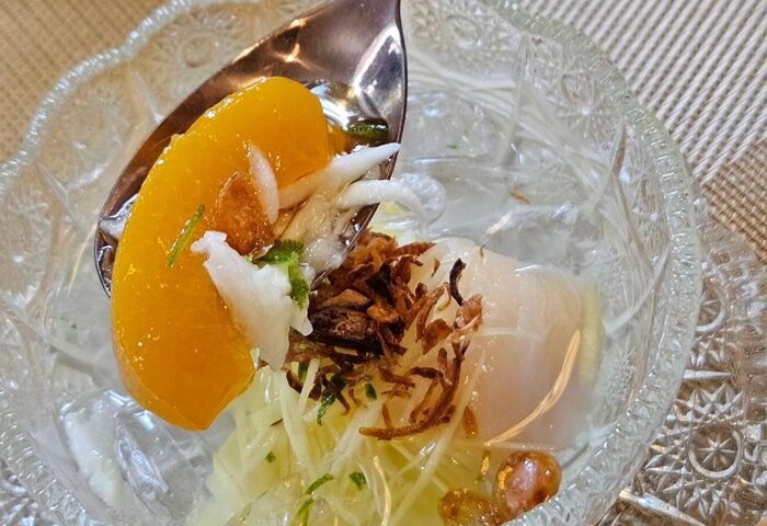 ตบท้ายด้วยของเมนูของหวาน มี 2 อย่างให้เลือก คือ “จากบางน้ำผึ้ง” ผลไม้ประจำถิ่น เนื้อนุ่มหนึบเหนียว และ “ส้มฉุน” เมนูของหวานโบราณ เป็นเครื่องว่างที่อยู่ในกาพย์เห่ชมเครื่องคาวหวานในรัชกาลที่ 2 ผลไม้ที่นิยมนำมาลอยแก้ว คือ ลิ้นจี่ และผลไม้เปรี้ยวอย่าง มะยงชิด ทางร้านยังนำมะม่วงเบา ซึ่งปลูกที่คุ้งบางกะเจ้ามาลอยแก้วด้วย และใส่ลูกพีชโครงการหลวง เพิ่มรสชาติที่หอมละมุนขึ้น ส่วนน้ำส้มฉุนใช้ผลของส้มซ่าคั้นน้ำ แล้วเอาเปลือกไปต้มจนมีกลิ่นออกมา แล้วเวลาเสิร์ฟใส่มะม่วงซอย ขิงซอย หอมเจียว ถั่วลิสง และโรยด้วยผิวส้มซ่า เวลาทานจะได้รสเปรี้ยว หวาน หอม ชื่นใจ