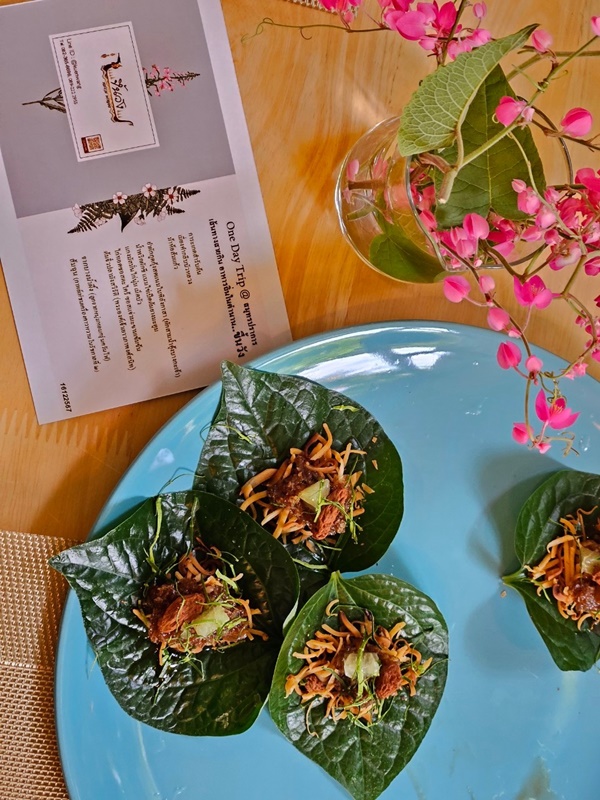 ระหว่างที่รอลุ้นผ้ามัดย้อม ทางชุมชนจัดเครื่องดื่มและของว่างมาเสิร์ฟ คือ น้ำตะลิงปริงคั้นสด รสเปรี้ยวอมหวาน ดื่มแล้วสดชื่นมาก และของว่างที่เป็นซิกเนเจอร์ของที่นี่ คือ เมี่ยงกลีบบัวพริกเกลือ ซึ่งแตกต่างจากเมี่ยงกลีบบัวที่เราเคยทานทั่วไป ตรงที่เค้าจะผสมมะพร้าวคั่วกับน้ำเมี่ยงคำคลุกเคล้าให้เข้ากัน หน้าตาเหมือนพริกเกลือ ทำให้ทานได้สะดวกมากขึ้น ถ้าติดใจสามารถสั่งกลับบ้านได้ด้วยค่ะ