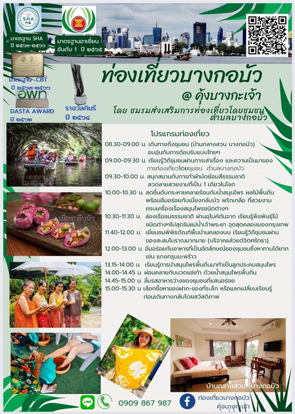 ชุมชนบางกอบัว ต.บางกะเจ้า อ.พระประแดง จ.สมุทรปราการ 10130 โทร.090 986 7989 เฟซบุ้ก : ท่องเที่ยวบางกอบัว คุ้งบางกะเจ้า