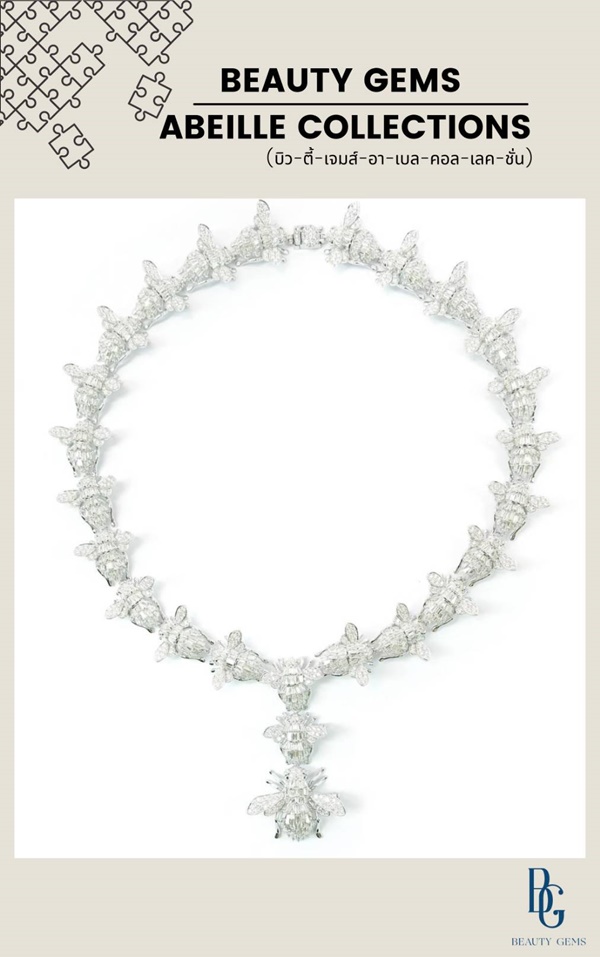 BEAUTY GEMS ABEOLLE COLLECTIONS (บิว-ตี้-เจมส์-อา-เบล-คอล-เลค-ชั่น) รังสรรค์โดยใช้ผึ้งมาเป็นตัวแทนของความมุ่งมั่น ขยันขันแข็ง ลักษณะนิสัยของผึ้งชอบการรวมตัวและเกาะกลุ่มกันในบริเวณรวงผึ้ง สื่อถึงความสามัคคี คอลเลคชั่นนี้จึงรังสรรค์ให้ผึ้งเรียงร้อยต่อเป็นสร้อยคออันงดงาม และผึ้งยังเป็นอีกหนึ่งในสัญลักษณ์ของความรักอันแสนหวาน สัญลักษณ์แห่งการบอกรัก เหล็กในของผึ้งเปรียบดั่งสายศรรักของกามเทพ ผู้บันดาลรักแก่มนุษย์ทุกคน ยังมีความเชื่อทั้งทางตะวันออกและตะวันตกว่าสีเหลืองนวลของน้ำผึ้งนั้นเป็นน้ำอันบริสุทธิ์ แสดงถึงรักแท้ จึงเป็นที่มาของคำว่า ฮันนีมูน หรือน้ำผึ้งพระจันทร์ เครื่องประดับคอลเลคชั่นนี้จึงเปรียบเสมือนความงดงามและความรักที่ร่วมเติมเต็มความสุข ประกอบด้วย เพชร น้ำหนักรวม 28 กะรัต ทอง 18K White Gold น้ำหนักรวม 101 กรัม