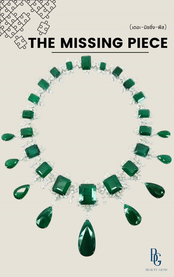 THE MISSING PIECE (เดอะ-มิซซิ่ง-พีส) สร้อยคอมรกตประดับเพชร ตัวแทนของความงดงามที่สมบูรณ์แบบ เต็มเปี่ยมไปด้วยความสุข ด้วยมรกตทรงหยดน้ำและทรงสี่เหลี่ยมหลากหลายเม็ด ซึ่งถูกรังสรรค์นำมาเรียงร้อยกัน เข้ากับความระยิบระยับของเพชรเปรียบเสมือนชิ้นส่วนสำคัญ เมื่อนำประกบอยู่ร่วมกันยิ่งช่วยส่งเสริมเสน่ห์และความงดงามราวกับชิ้นงานศิลปะอันล้ำค่า ที่คอยเติมเต็มความสุขและความสง่างาม ประกอบด้วย มรกต น้ำหนักรวม 333 กะรัต เพชร น้ำหนักรวม 41 กะรัต ทอง 18K White Gold น้ำหนักรวม 105 กรัม