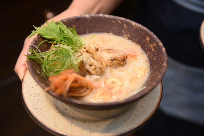 Hotate & Ebi Tonkotsu Somen เมนูทงคตซึราเมง หรือ ราเมงซุปกระดูกหมู เดิมทีเป็นเมนูยอดนิยมจากเกาะคิวชู ซึ่งร้านทงคตซึราเมงที่คิวชูจึงนำเอาโฮตาเตะมาทำเป็นท็อปปิ้ง เลือกใส่เส้นโซเมงให้ทานง่าย ผสมกับความหวานอร่อยจากนํ้าซุปกระดูกหมูที่ถูกเคี่ยวมากกว่า 2 วัน ผสมกับความหอมหวานของหอยโฮตาเตะ และกุ้งอากะเอบิ