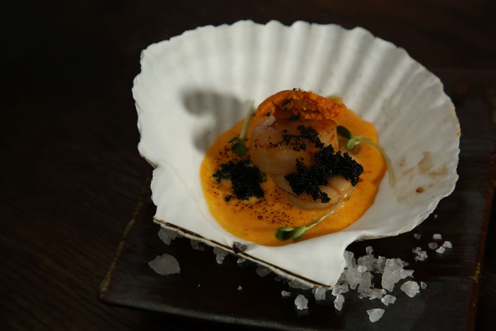 Uni Hotate Yaki with Uni sauce อุนิซอส ที่ทำให้นึกถึงเกาะโอกินาว่า ทางตอนใต้ของประเทศญี่ปุ่น ใครที่เคยไปจะเห็นร้านอาหารหลายๆ ร้าน นำอุนิซอสมาผสม หรือกระทั่งร้านปิ้งย่างในตลาดสด เอาอุนิซอสมาราดใส่ กุ้ง หอย แล้วนำเสิร์ฟ เมนูนี้จึงเอาอุนิทำเป็นซอส ทานคู่กับหอยโฮตาเตะย่าง ท็อปด้วยอุนิอีกทีด้านบน