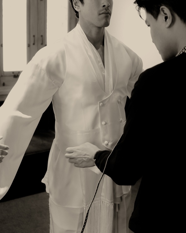 ดีไซน์ของชุดมาในโทนสีขาวงาช้างทั้งลุค โดดเด่นด้วยเสื้อเชิ้ตผ้าไหมเนื้อเงาที่ให้สัมผัสบางเบาและเคลื่อนไหวไปตามจังหวะร่างกายอย่างเป็นธรรมชาติ เลเยอร์ทับด้วยเวสต์ที่ตัดเย็บด้วยผ้าไหมไทยทรงคลาสสิกที่ช่วยเพิ่มโครงสร้างให้ลุคดูเนี้ยบขึ้น ขณะที่กางเกงทรงขากว้าง ที่ช่วยสร้างความผ่อนคลายและความร่วมสมัยในเวลาเดียวกัน