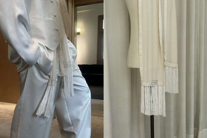 อีกหนึ่งจุดเด่นสำคัญคือดีเทลผ้าพันคอที่ทำจากผ้าไหมซาติน โดดเด่นด้วยงานหัตถศิลป์อันประณีต ที่ปล่อยชายผ้าให้ทิ้งตัวอย่างอิสระ เสริมมิติและเพิ่มความพลิ้วไหวให้กับทั้งลุค สะท้อนความตั้งใจของณเดชน์ที่ต้องการให้ชุดมีความสบาย เหมาะกับการเฉลิมฉลองในช่วง After Party โดยไม่ทิ้งความเนี้ยบในแบบเจ้าบ่าว