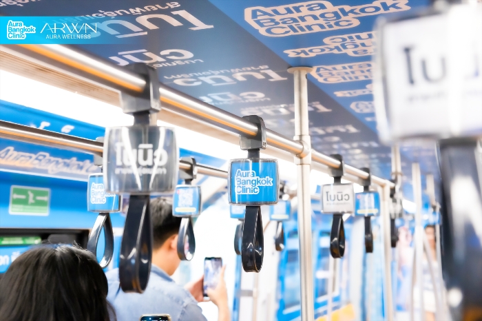 ออร่าดึงความสนใจของคนเมืองที่ใช้บริการรถไฟฟ้าบีทีเอส ด้วยการ Wrap ทั้งขบวน ให้กลายเป็นขบวนรถไฟฟ้าของออร่า เน้นใช้สีฟ้าที่เป็นสีหลักของคลินิกและใช้ภาพ โยชิ รินรดา Presenter สาวสวยและ Beauty Icon ที่คนทุก gen รู้จัก เสิร์ฟความคุ้มค่าด้วยการแจก Voucher ส่วนลดทำหัตถการมูลค่า 500 บาท รับความคุ้มสองต่อ เมื่อสแกน QR Code ที่ Handgrip รับโปรโมชั่นโบท็อก Neuronox ราคาพิเศษ ทุกคนที่ขึ้นรถไฟฟ้าสามารถหยิบ Voucher ได้ไม่จำกัด และใช้ส่วนลดได้ที่ Aura Bangkok Clinic ทุกสาขา