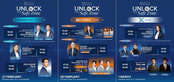 ร่วมปลดล็อกความสวย เซฟด้วยมาตรฐานความปลอดภัยสูงสุดในงาน “UNLOCK BEAUTY SAFE ZONE” ได้ตั้งแต่วันที่ 27 กุมภาพันธ์ – 1 มีนาคม 2569 ณ โซนอีเดน ชั้น 1 ศูนย์การค้าเซ็นทรัลเวิลด์ ติดตามรายละเอียดเพิ่มเติมได้ที่ Facebook: Merz Aesthetics Thailand และ Line OA @merzbeautyconnect