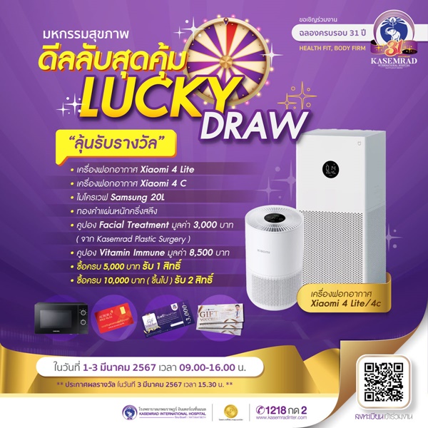 โรงพยาบาลเกษมราษฏร์ อินเตอร์เนชั่นแนล รัตนาธิเบศร์ ฉลองครบรอบ 31 ปี ระหว่างวันที่ 1-3 มีนาคม 2567 บริเวณโถง OPD ชั้น 1 อย่างยิ่งใหญ่ ภายใต้แนวคิด “สุขภาพฟิต ร่างกายเฟิร์ม “Health Fit, Body Firm”