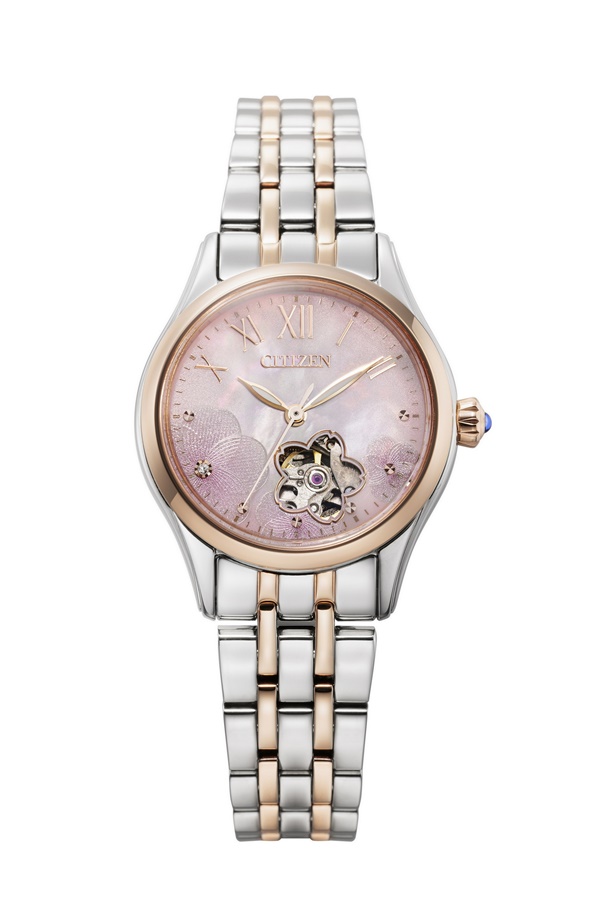 CITIZEN รุ่นPR1044-87Y Sakura Limited Edition Collection หวานละมุนแฝงความโก้ด้วย ตัวเรือนสเตนเลสโทนสีเงินพร้อมสายสเตนเลสทูโทน กรอบสเตนเลสสีโรสโกลด์ โดดเด่นด้วยหน้าปัดลายดอกซากุระกำลังเบ่งบานพลิ้วไหวตามสายลม ทำจากเปลือกหอยมุกสีชมพู สะท้อนความประณีตในแบบฉบับช่างฝีมือญี่ปุ่น รวมถึงการฉลุลายเผยให้เห็นการทำงานของกลไกจักรกลอัตโนมัติคาลิเบอร์ 6628