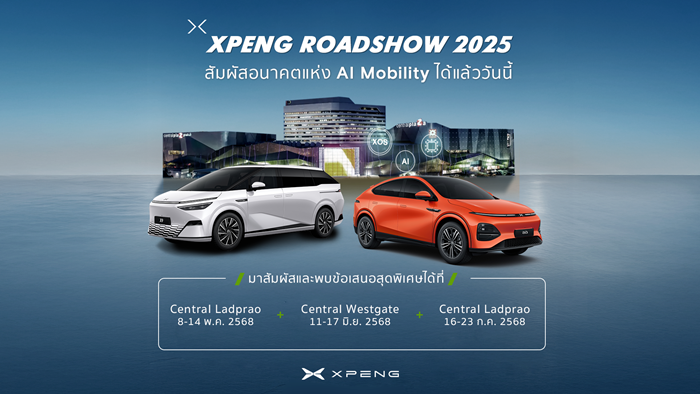 เอ็กซ์เผิง ประเทศไทย ผู้นำเข้าและจัดจำหน่ายยานยนต์ไฟฟ้าอัจฉริยะระดับพรีเมียม–ไฮเทค ‘เอ็กซ์เผิง’ อย่างเป็นทางการ จัดงานใหญ่ ‘XPENG ROADSHOW 2025’ ให้ผู้สนใจได้สัมผัสอนาคตแห่ง AI MOBILITY กับ เอ็กซ์เผิง G6 และ X9 พร้อมจัดหนักข้อเสนอสุดพิเศษ เพิ่มโอกาสเป็นเจ้าของยานยนต์ไฟฟ้าอัจฉริยะ ณ ศูนย์การค้าชั้นนำในกรุงเทพมหานคร ตลอดช่วงเดือนพฤษภาคม–กรกฎาคม 2568