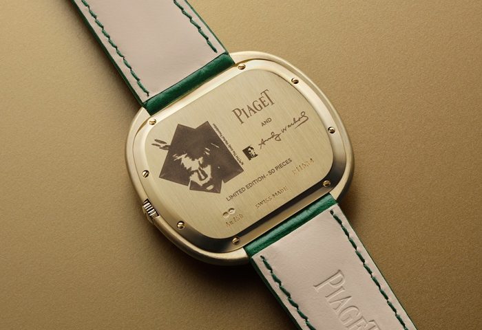 หน้าปัดล้อมกรอบด้วยตัวเรือนเยลโลว์โกลด์ 18 กะรัต ขนาด 45 มม. ขอบตัวเรือนดีไซน์แบบขั้นบันได และจับคู่กับสายหนังสีเขียวเข้มที่ให้ความรู้สึกหรูหราแต่ไม่แย่งความสนใจไปจากหน้าปัดได้ เมื่อพลิกมาที่ด้านหลังตัวเรือนจะพบกับการตกแต่งด้วยการขัดลายซาตินแนวตั้ง ซึ่งปกป้องกลไกที่อยู่ภายใน อย่าง กลไกอัตโนมัติ Calibre 501P1 ที่ผลิตขึ้นภายในโรงงานของ Piaget เอง มอบสำรองลานยาวนาน 40 ชั่วโมง พร้อมการตกแต่งลาย Côtes de Genève อันประณีต เหนือสิ่งอื่นใด ที่ฝาหลังยังปรากฏภาพสลักใบหน้าของ Andy Warhol จากภาพถ่ายพอร์เทรตของกล้องโพลารอยด์อันเป็นต้นแบบแห่งแรงบันดาลใจในการสร้างสรรค์นาฬิกาเรือนนี้ พร้อมด้วยโลโก้ Piaget และลายเซ็นของศิลปินผู้ยิ่งใหญ่ และนี่คืออีกชิ้นงานที่รังสรรค์ขึ้นเพื่อตอบโจทย์ผู้ที่แสวงหาเรือนเวลาอันทรงคุณค่าและควรค่าแก่การสะสม