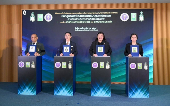 วันที่ 24 มีนาคม 2569 สำนักงานการวิจัยแห่งชาติ(วช.) กระทรวงการอุดมศึกษา วิทยาศาสตร์ วิจัยและนวัตกรรม จัดพิธีลงนามบันทึกข้อตกลงความร่วมมือทางวิชาการในการพัฒนาบุคลากรวิจัยและนวัตกรรม ภายใต้หลักสูตรการพัฒนาธรรมาภิบาลและจริยธรรมสำหรับนักบริหารงานวิจัยมืออาชีพ ระหว่างสำนักงานการวิจัยแห่งชาติกับสถาบันพระปกเกล้า