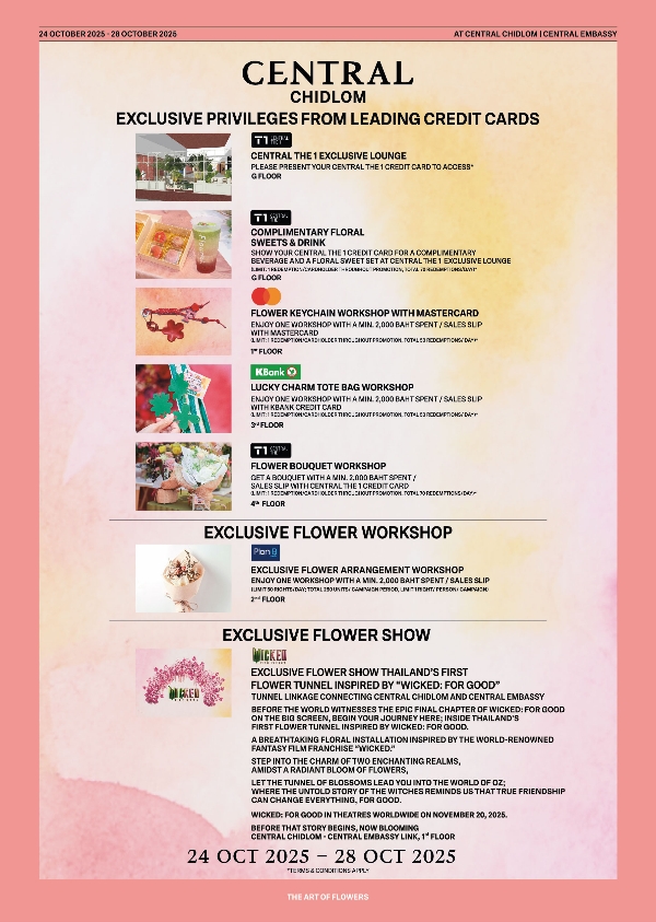 - ครั้งแรกของประเทศไทย! กับ “THE FLOWER TUNNEL INSPIRED BY WICKED FOR GOOD” พบกับอุโมงค์ดอกไม้สุดตระการตาที่ได้รับแรงบันดาลใจจากภาพยนตร์แฟนตาซีชื่อดังระดับโลก “WICKED” พร้อมให้คุณสัมผัสเสน่ห์ของสองมนตรา ผ่านหมู่มวลดอกไม้ที่เปล่งประกายงดงาม ที่บริเวณทางเชื่อม ชั้น 1 ห้างเซ็นทรัลชิดลม และเซ็นทรัล เอมบาสซี และเตรียมพบกับ Wicked: For Good Experience ที่ ชั้น G ห้างเซ็นทรัลชิดลม ในวันที่ 11 – 30 พ.ย. 68